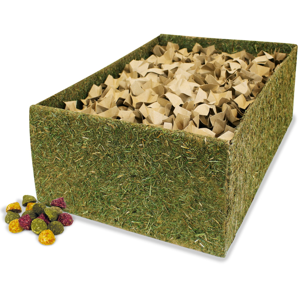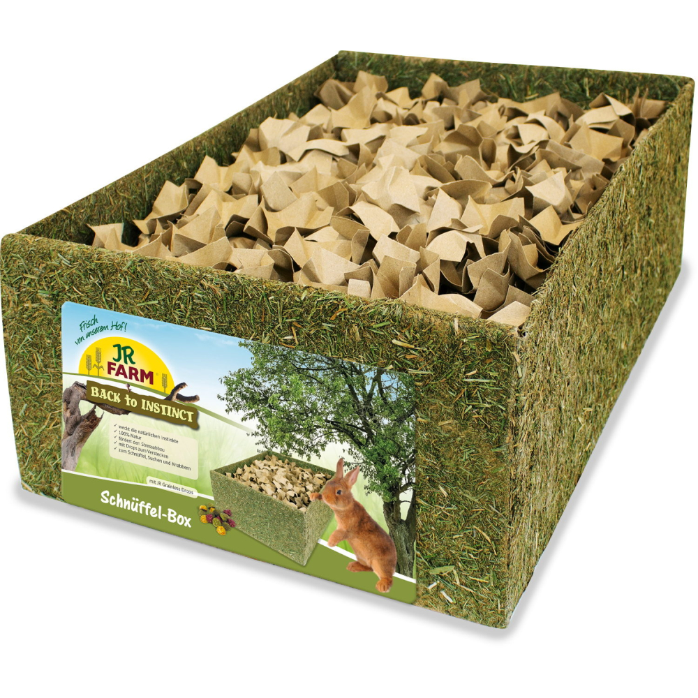 Knaagdieren en konijnen zijn van nature druk bezig met graven en zoeken naar voedsel in de bodem. Je kunt de bijgevoegde JR Grainless Drops op verschillende diepten in de papiersnippers verbergen en je dieren zullen moeten zoeken naar het lekkers. Dat geeft veel uitdaging en beloning als ze het zelf vinden. Dit gaat verveling tegen en bevordert ook de stressvermindering bij de dieren. De doos zelf, evenals de papiersnippers, zijn onbehandeld. De dieren kunnen er dus gerust aan knagen. Uiteraard kan de box ook gevuld worden met andere materialen zoals stro, zand, hooi etc.