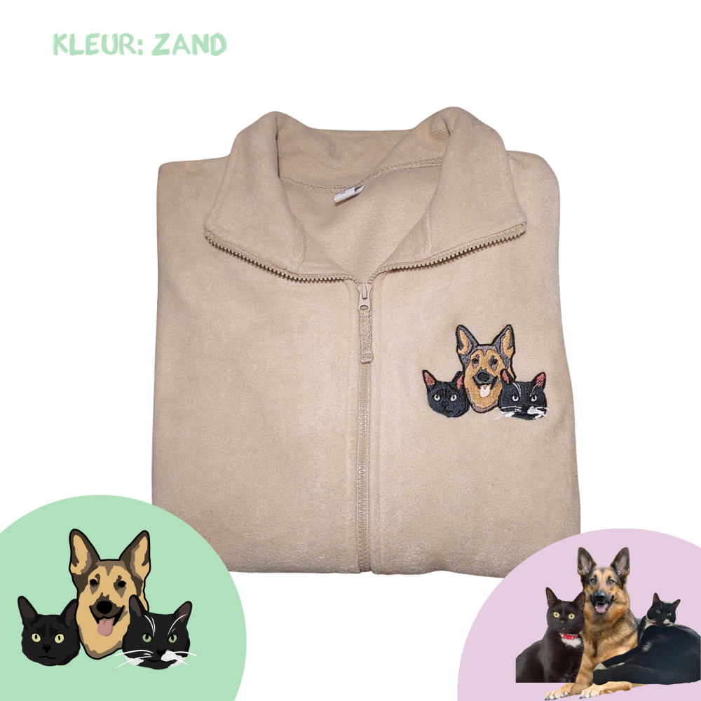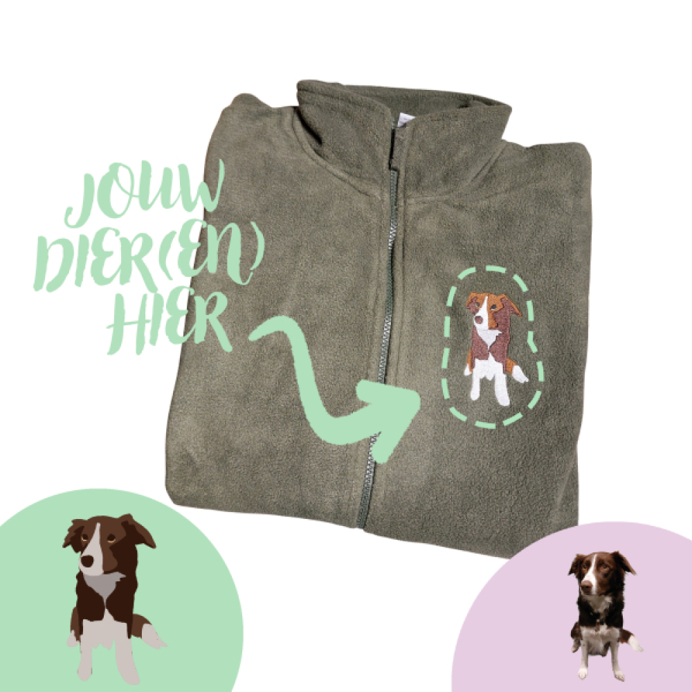 Je kan er voor kiezen om de naam van je dier(en) op de mouw van je fleece vest te laten borduren.