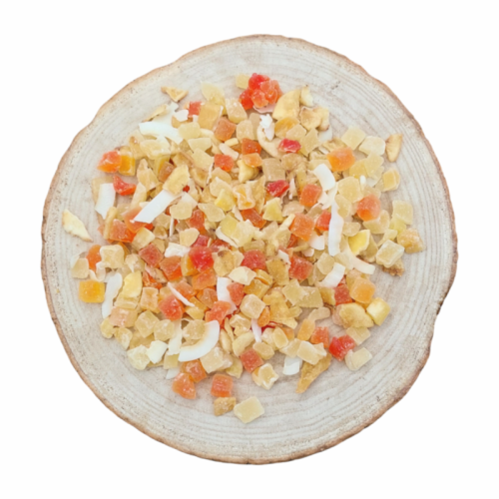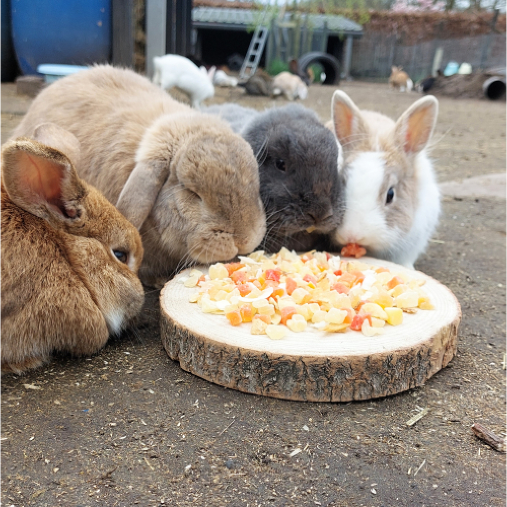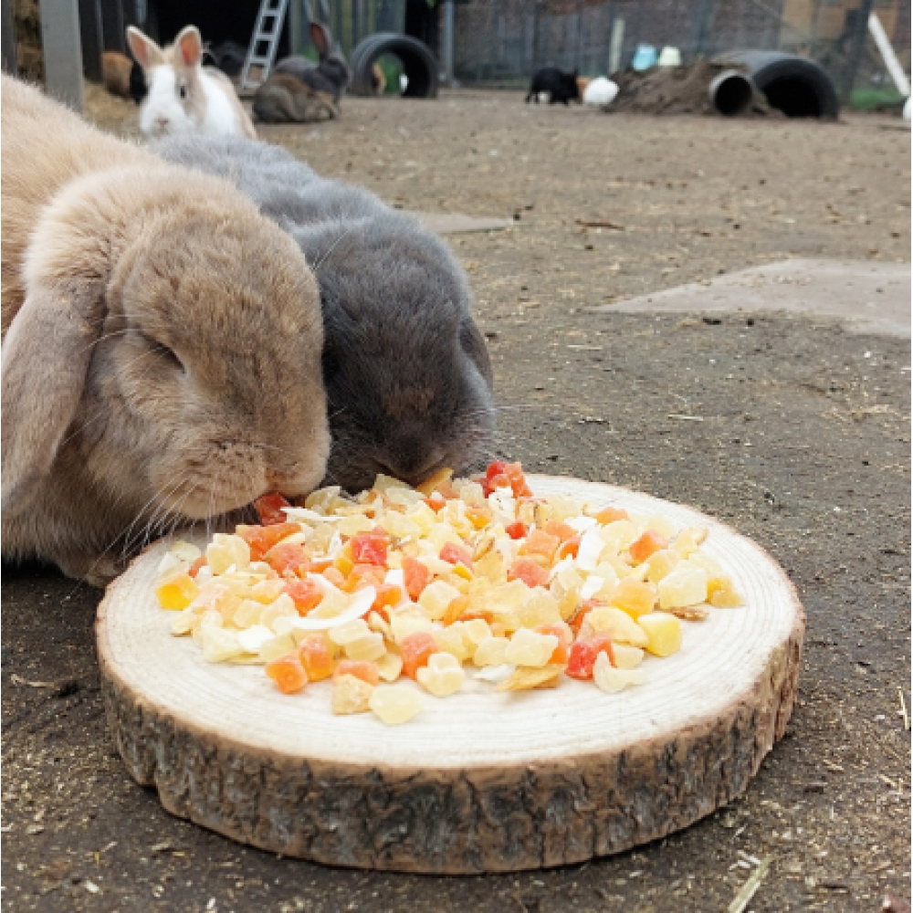 Je kan de fruitmix door het hooi mengen om het hooi aantrekkelijker te maken om zo je konijn meer hooi te doen laten eten. Gebruik het als beloning snoepje of stop het in een speeltje. Of doe de stukjes fruit bijvoorbeeld in een snackbal.