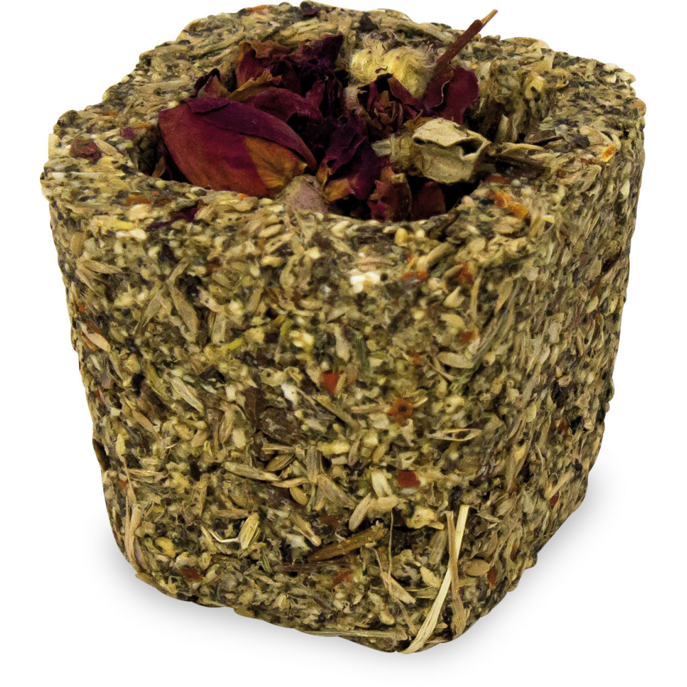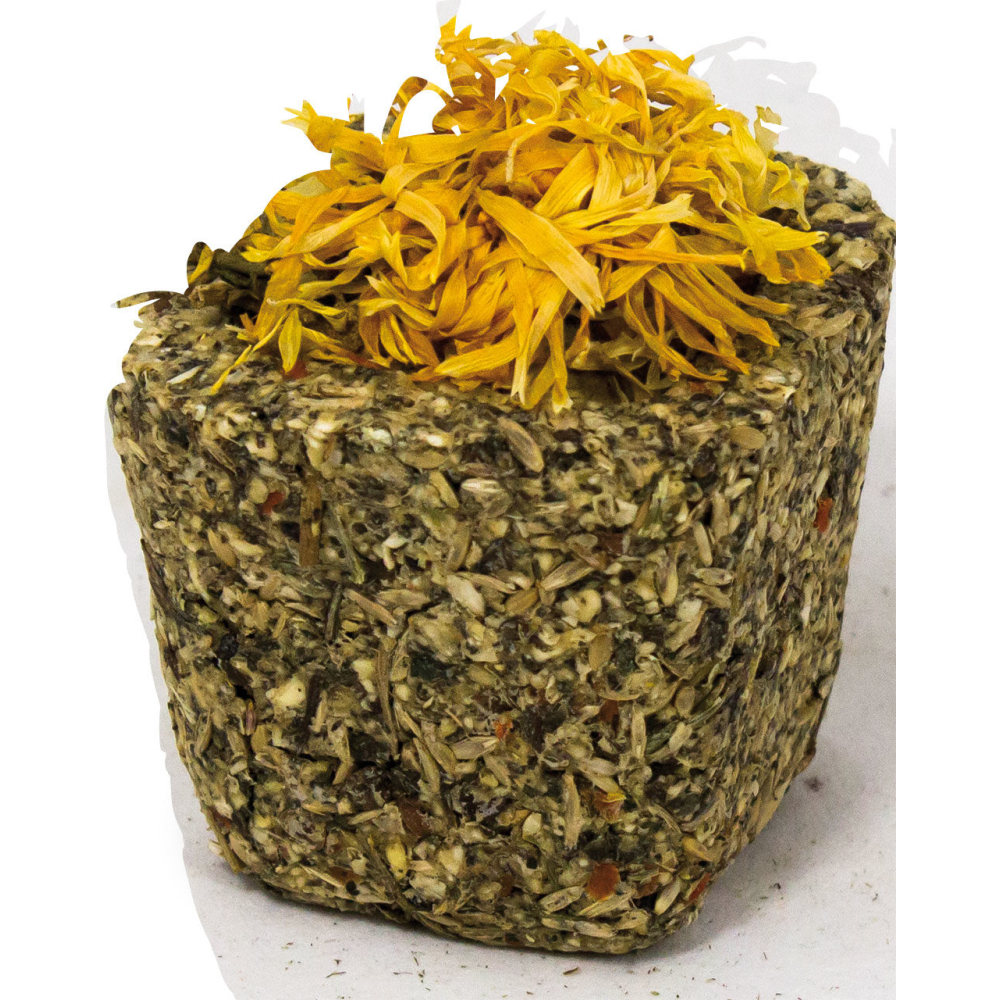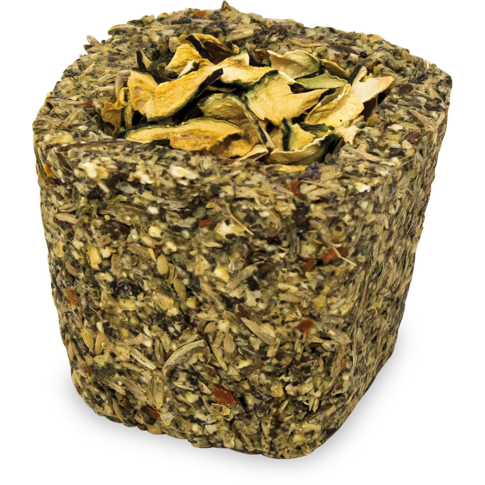 Ingrediënten:erwten. plantaardig zetmeel. zaden van granen. kanariegraszaad. brandnetel 4.1%. boekweit 3.5%. peterselie 1.8%. wortelen 1.7% (Vulling: wortelen 0.4%%. courgette 0.4%. pastinaken 0.4%. rozenbloesems 0.4%. goudsbloembloesems 0.3%. korenbloemblaadjes 0.3%). hennepzaad. lijnzaad. venkel. pepermunt. paardenbloem. komijnzaad