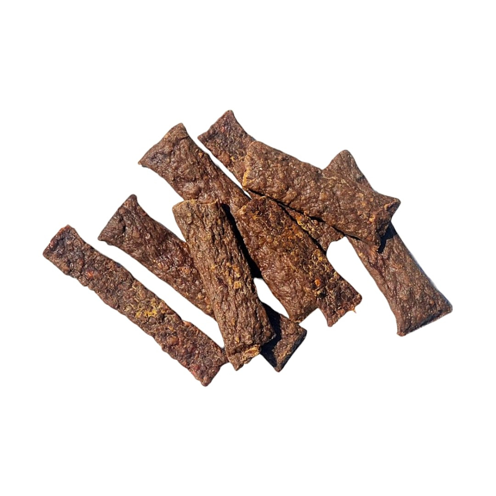 Elke 100 gram Paard Vleesstrips is gemaakt van 500 gram vers vlees.