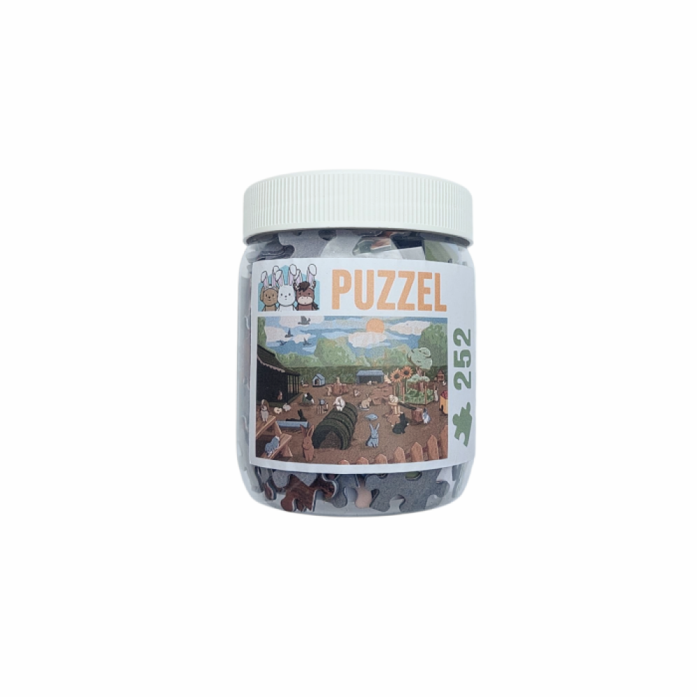 Deze puzzel van ons konijnendorp zit in een plastick pot.