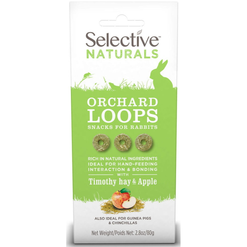 Supreme Selective Orchard Loops bevatten timothy hooi en appel. De snacks zijn rijk aan vezels, rijk aan natuurlijke ingrediënten, bevatten geen toegevoegde kleurstoffen en geen toegevoegde suikers.