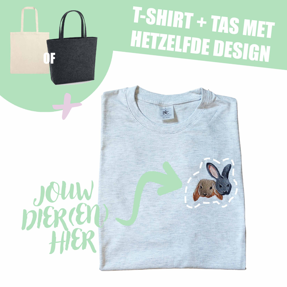 Let op! Op een T-shirt kan je niet het volledige dier laten borduren. Wil je dit graag op een tas. Bekijk dan zeker onze andere producten!