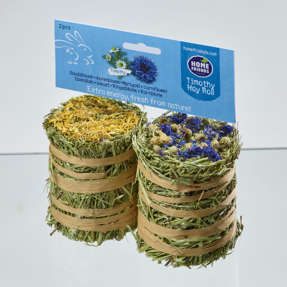 Hooi vormt het meest belangrijke voedingsbestanddeel voor konijnen en knaagdieren. Homefriends Timothy Hay Roll combineert zoetgeurend timothy hooi met een heerlijke topping. Vers van het land, zorgvuldig gedroogd en boordevol ruwe vezels! Zorg ervoor dat uw huisdier altijd over voldoende hooi en vers water beschikt.