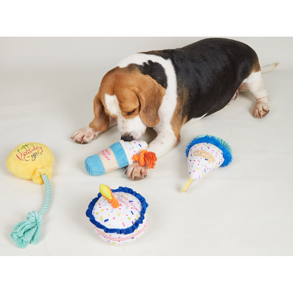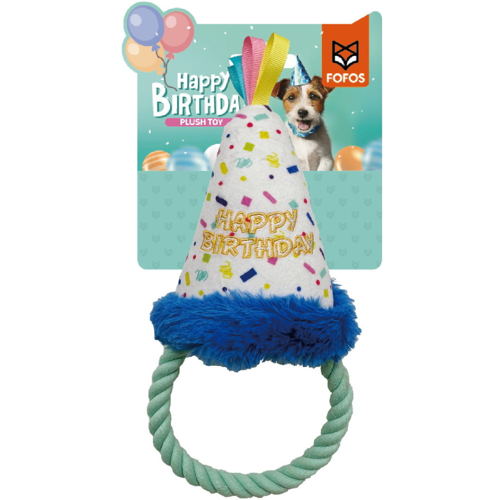 De Fofos Verjaardagshoed is een hondenspeeltje in verjaardag thema. Met deze hoed vieren jij en jouw hond een feestje!