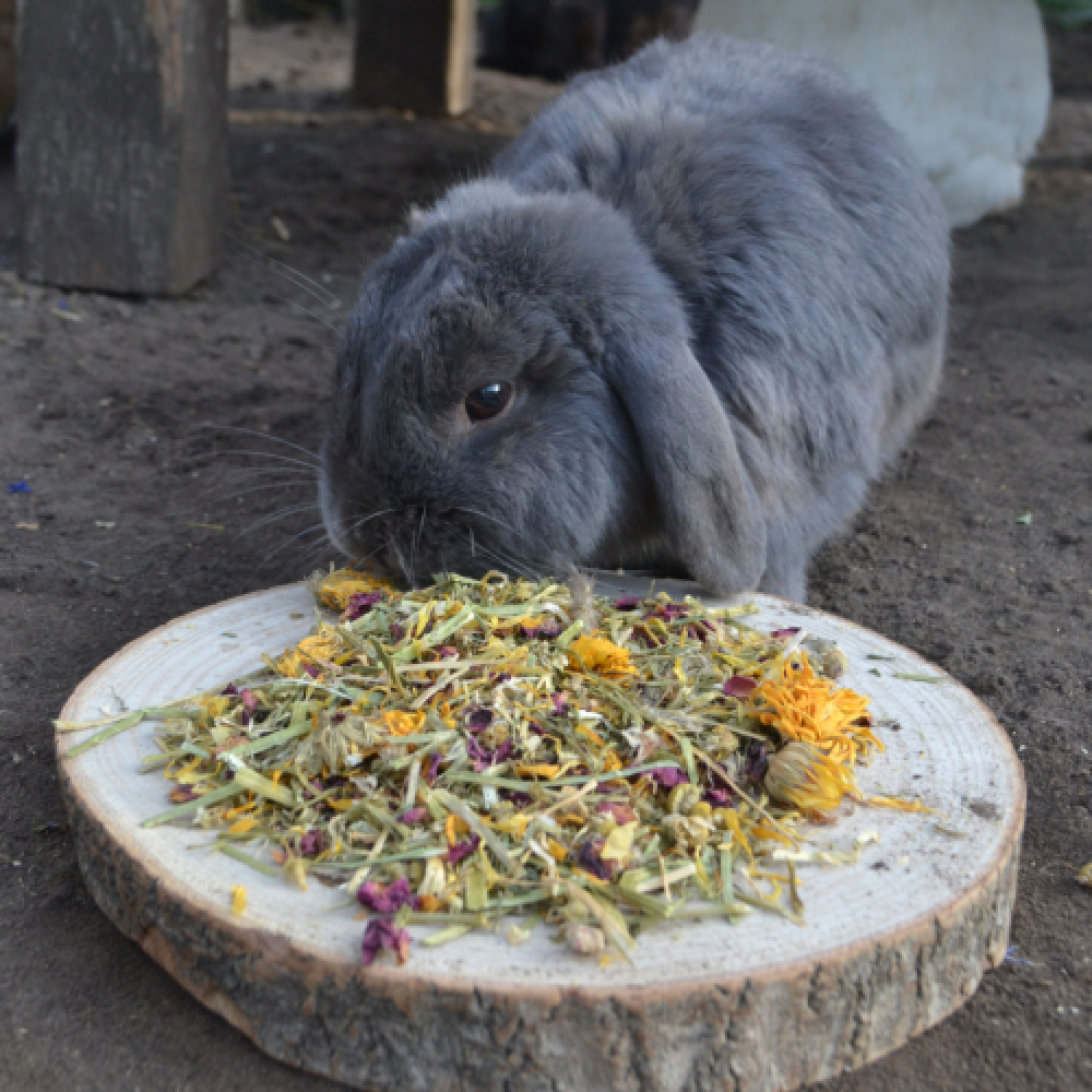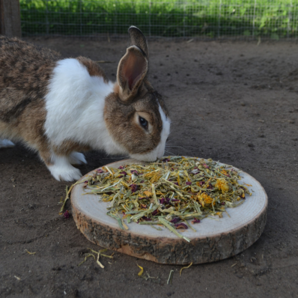 Je kan de mix ook door het hooi mengen om het hooi aantrekkelijker te maken om zo je konijn meer hooi te doen laten eten.
