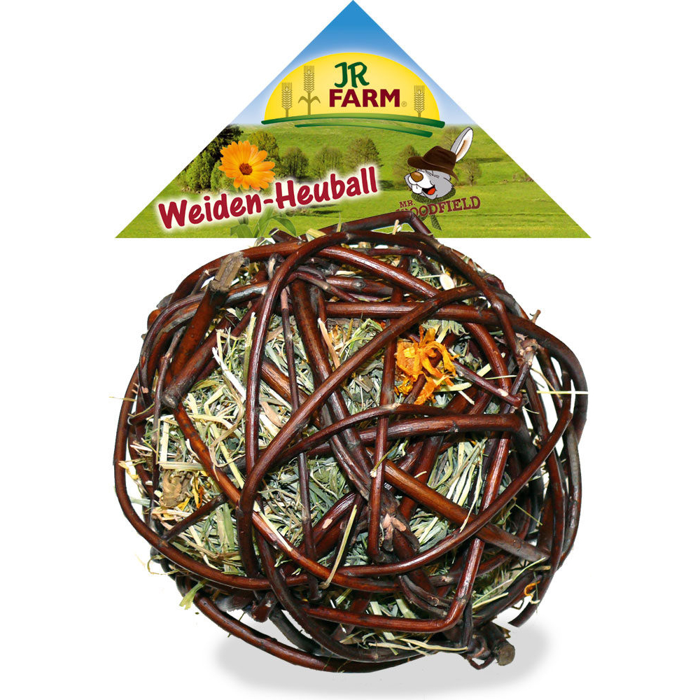 Deze bal van natuurlijk weigroen is gevuld met weidehooi en goudsbloemen.